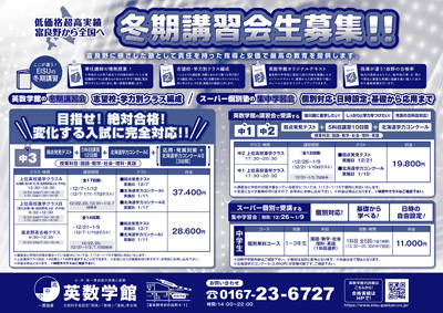 「冬期講習会」の生徒募集の季節がやってきました。中三生にとっては、この冬の講習が運命を握ると言っても過言ではありません。英数学園では、なんと12月7日から弱点発見テストを開始!!早めに弱点を見極めて早めの対策を始めましょう。志望校、学力別のクラス編成で抜かりのない勉強を身につけましょう。もちろん、中2、中1生も弱点発見テストあり!なんとなくの勉強から脱出です。講習の詳細は、こちらまでお問い合わせください。問い合わせ先 0167-23-6727 14時〜22時まで